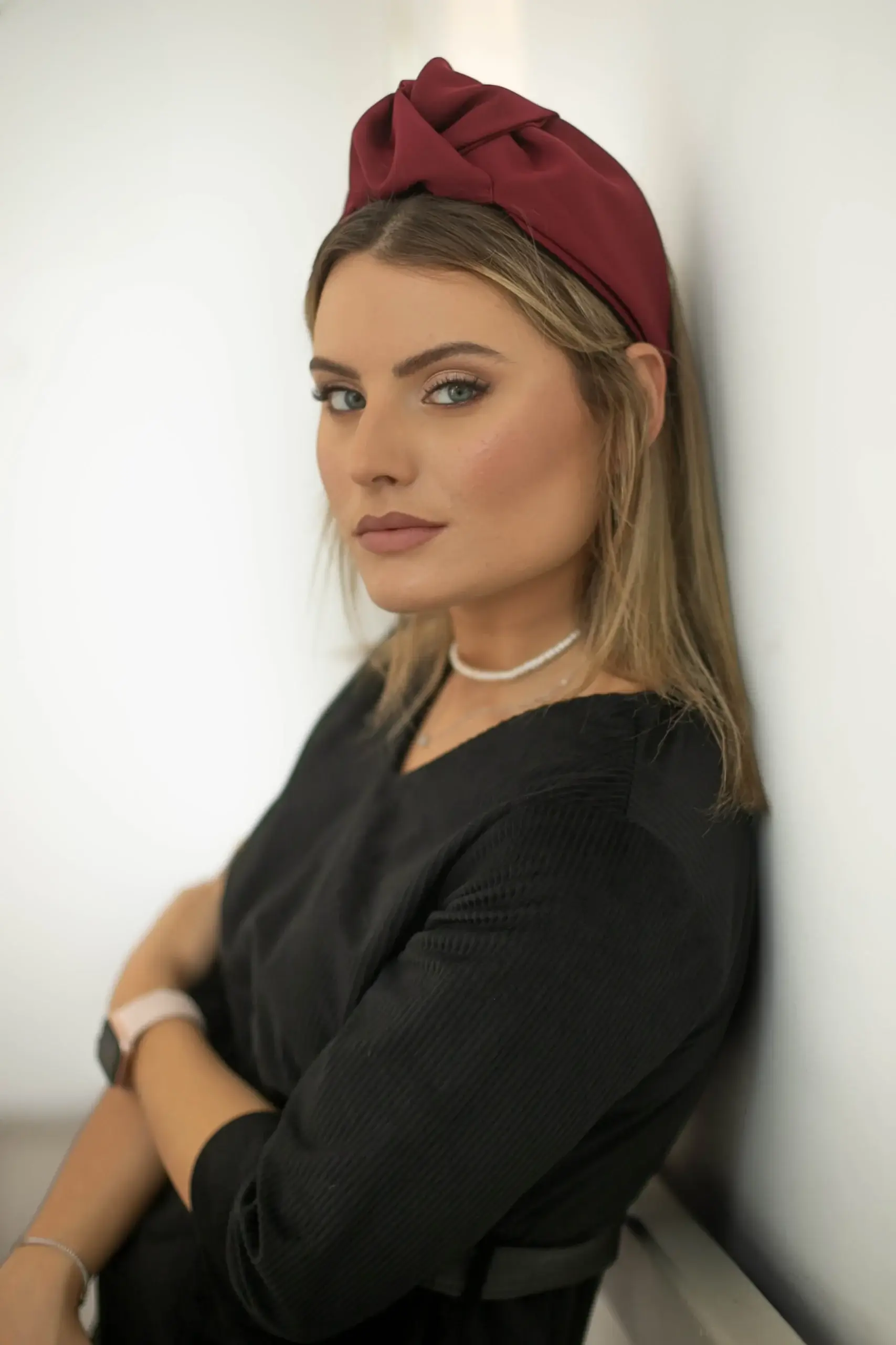 קשת מבד אריג בצבע סורדו עם קישוט קשר מובנה