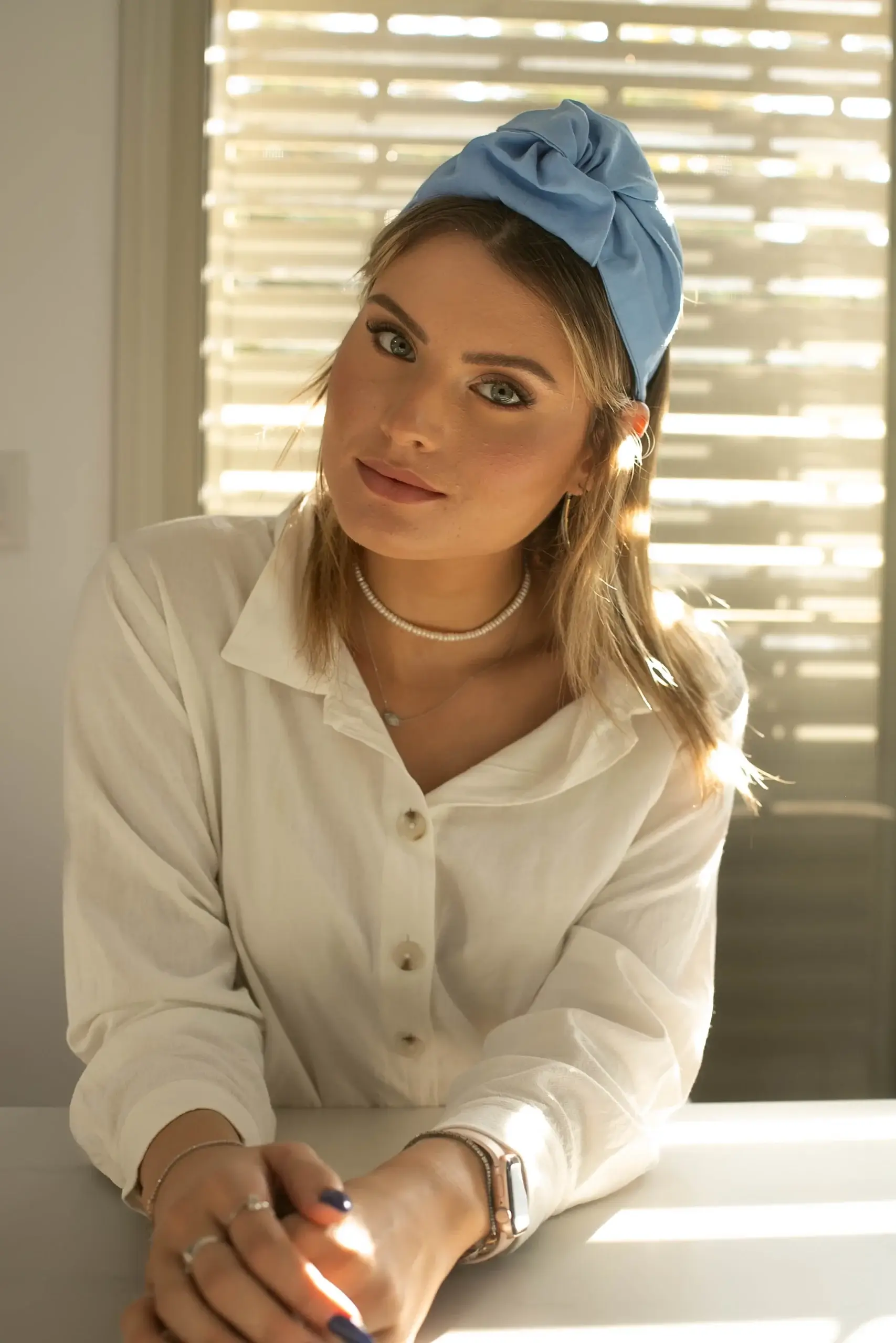 קשת מבד כותנה בצבע תכלת עם קישוט קשר מובנה
